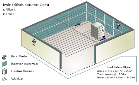 Hazırlanacak kurutma odası 100 m³ (metreküp)' den büyük olmamalıdır. 100 m³' den daha büyük olan odalar için ikinci makineye ihtiyaç duyulacaktır. Hacim ölçüsü olan metreküp, odanın metrekaresi ve tavan yüksekliği ile alakalıdır. Tavan yüksekliğinin 2.5 m' den daha yüksek olması önerilmez.