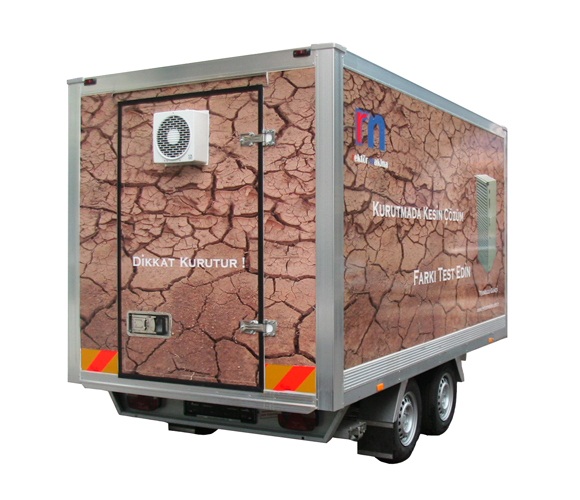 Römorklu Taşınabilir Test Amaçlı Kurutma OdasıÜrettiğimiz kurutma makinelerini test etmeniz için özel olarak tasarlanmış, römorklu taşınabilir kurutma odamızda halı kurutabilirsiniz. Test odasına ortalama 100 m² halı sığmaktadır. Halıların kuruma süresi 6 ila 8 saat arasındadır.